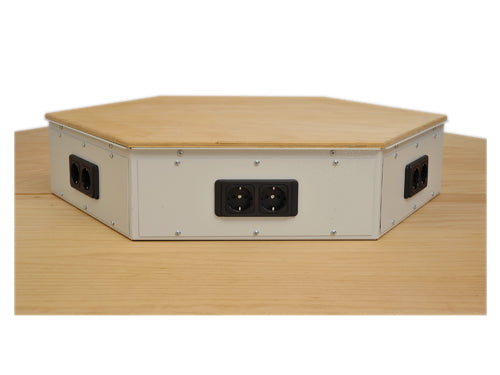 6-Eck Energieaufsatz, 2er Schuko-Steckdosen je Arbeitsplatz, Abdeckung Buche Multiplex 25 mm